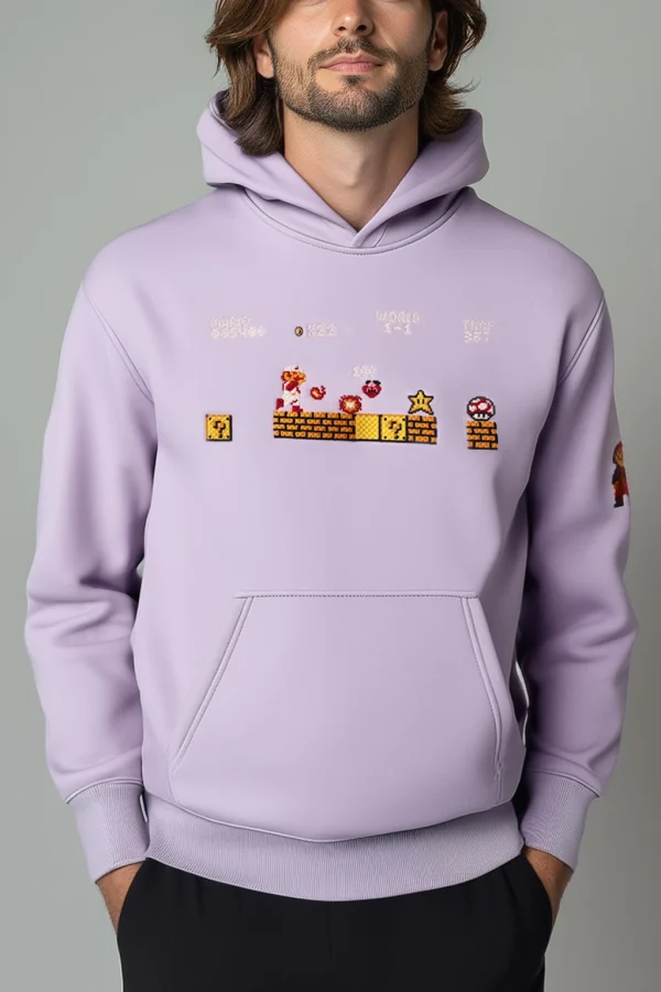 هودی طرح ماریو میکرو، با رنگ یاسی ملایم، گلدوزیهای باکیفیت و پارچه پنبهای گرم و نرم، ترکیبی از لطافت، استایل و کیفیت است — انتخابی متفاوت برای روزهای سرد و استایل اسپرت خاص.