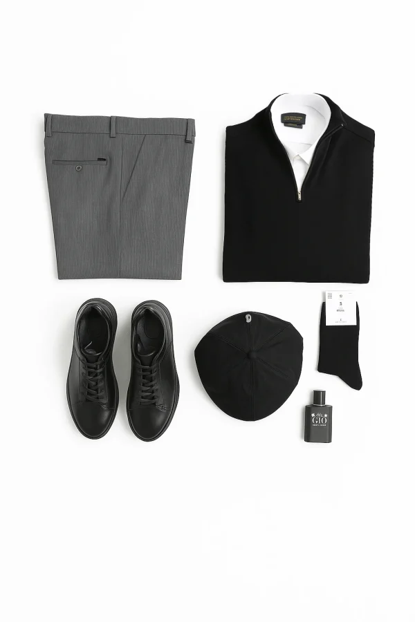 این ست بهطور هوشمندانه از رنگها و لباسهایی استفاده کرده که هم شیکاند و هم راحت. پیراهن سفید و شلوار دیپلمات ظاهری رسمیتر میسازند، درحالیکه بافت نیمزیپ و ونس چرم آن را روزمرهتر و کاربردیتر میکنند.