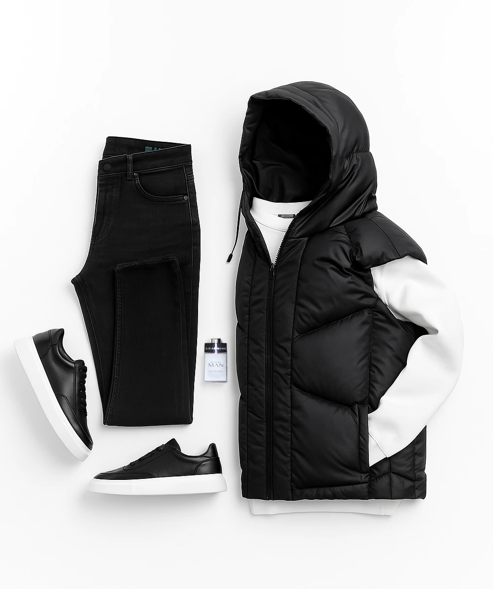 دورس سفید را با پافر مشکی لایهگذاری کنید، شلوار جین مام استایل ذغالی را اضافه کنید و با کفش ونس چرم مردانه استایل خود را کامل نمایید. برای جلوهای خاصتر میتوانید از اکسسوریهایی مانند ساعت اسپرت یا کلاه بافتنی استفاده کنید.